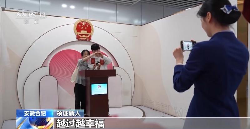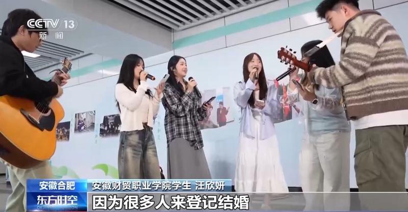 安徽财贸职业学院学生 汪欣妍:氛围特别好。尤其是去年5月20日的时候,很多人来登记结婚,看到他们幸福,我也觉得很幸福。