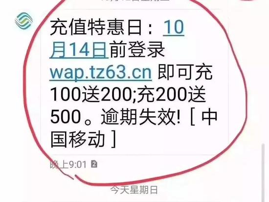 原标题:警方提醒:这条“10086”短信千万别信!已有多人被骗! 来源:工人日报 10086这个号码 好像一个操心的老母亲 天天发来关怀的短信 尊敬的客户您好,本月账单已发送到您的邮箱,请点击xxxxxx查看。 尊敬的客户您好,您本月话费余额还剩0.9元,欠费将影响您的正常使用,请尽快充值。 尊敬的客户您好,根据您的流量使用情况,建议您升级为xx元的套餐,请点击办理。 很多人收到这些短信一般直接删除了事 当然,也有人会点击一下链接查看详情 但是! 如果收到“10086” “充100送200,充200送500”的充值活动短信 别信!