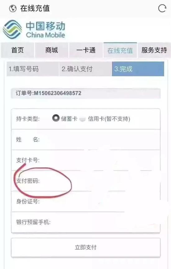 在正规页面填写银行卡号后 预留手机号码也会自动生成 如果在电脑上选择银行卡充值 会直接跳转到银行官方支付页面 不需要填写完整卡号和身份证号