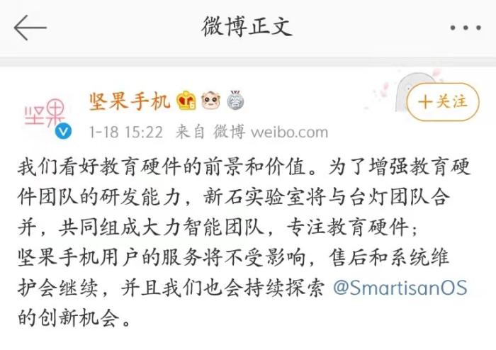 1月18日,坚果手机官方微博也表示:为了增强教育硬件团队的研发能力,新石实验室将与台灯团队合并,共同组成大力智能团队,专注教育硬件。坚果手机用户的服务将不受影响,售后和系统维护会继续,并且会持续探索 Smartisan OS的创新机会。