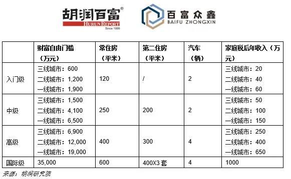 一线城市入门级财富自由门槛是1900万元,主要包括一套120平米的市区常住房、2辆车、60万元的家庭税后年收入和800万元的金融投资;中级财富自由门槛是6500万元,主要包括一套250平米的市区常住房、一套200平米的郊区第二住房、2辆车、150万元的家庭税后年收入和1200万元的金融投资;高级财富自由门槛是1.9亿元,主要包括一套400平米的市区常住房、一套300平米的郊区第二住房、4辆车、650万元的家庭税后年收入和6500万元的金融投资。