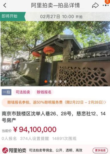 在南京市鼓楼区人民法院的阿里司法拍卖账号上,“沈举人巷26、28号,慈悲社12、14号”这个起拍价为94100000元的拍品,开拍时间为本月27日上午10点,目前已被浏览10000余次,374人设置了提醒。