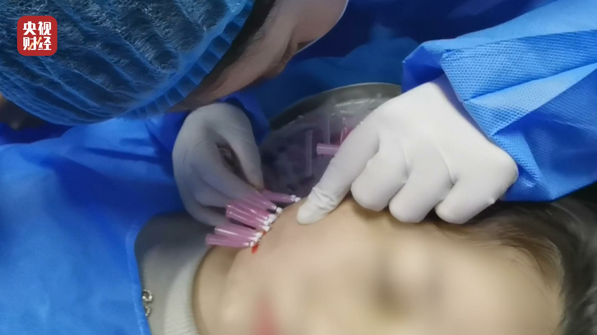 记者看到,老师先将几十支钝针挨个刺入学员一侧脸部的皮肤,隐隐看到有鲜血不断渗出。埋好蛋白线,老师又依次将钝针拔出,接下来给另一侧脸部进行埋线。