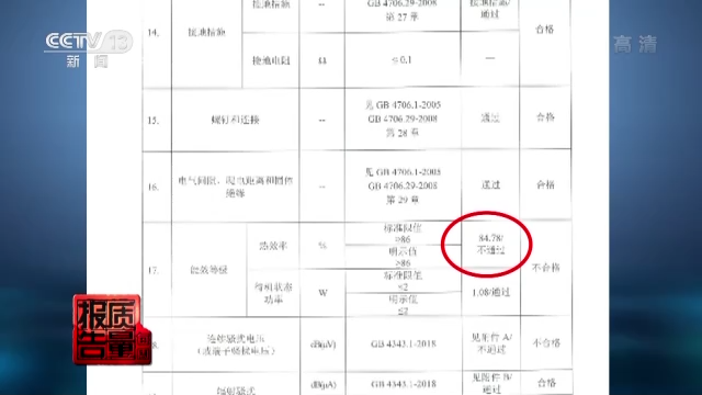 检测人员介绍,热效率是电磁灶将电能转化为有效热能的具体量化指标,相对于普通燃气灶50%左右的热效率,电磁灶更加经济高效,热效率可高达80%-92%,这也是许多消费者选购电磁灶的重要原因之一。根据国家标准,热效率分为三个等级,这台标称为佛山市顺德区莱品电器有限公司生产的奔腾王子牌电磁灶,热效率不得小于最低等级86%,但在检测过程中,其实测值仅有84.78%,被判定为不合格产品。