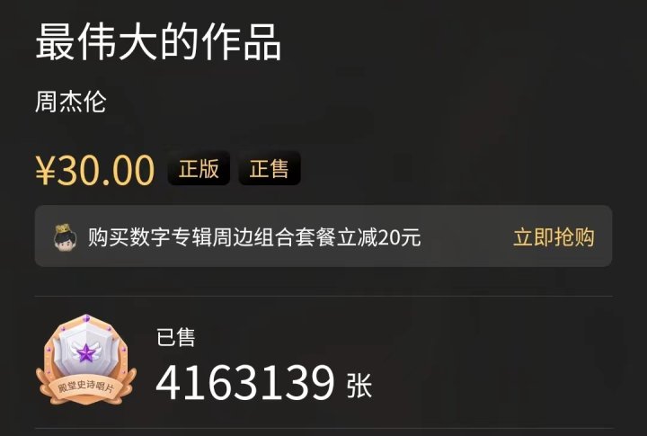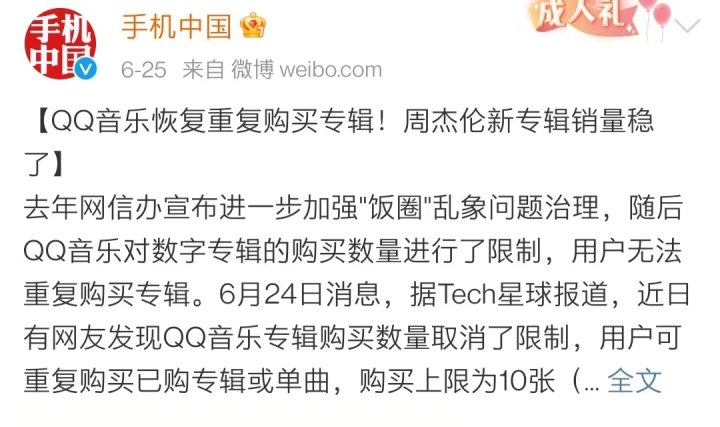 另外一件事发生在6月底,当时有人发现QQ音乐悄悄的恢复了数字的专辑的重复购买,当时就有所指地开玩笑说,“这是谁要发新专辑了”。目前来看,放开了购买数量限制的周杰伦新专辑,购买上限为10张。这个行为确实有可能推动周杰伦新专辑的销量。
