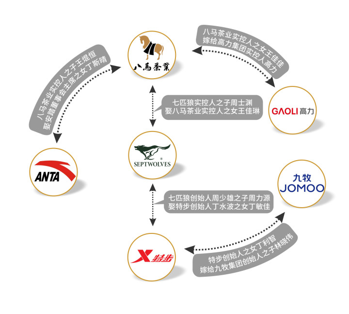 2020年,特步长公主丁利智嫁给九牧集团创始人林孝发的长子林晓伟,同年林晓伟入选《2020胡润Under30s创业领袖》;八马茶业的控股股东王文彬和陈雅静夫妇的女儿王佳佳,嫁给了高力集团控股有限公司的实控人高力;2020年,王文彬的儿子王焜恒与安踏体育老板丁世忠的女儿丁斯晴结婚。据胡润百富榜显示,丁世忠在2020年8月底的身家为445亿元。