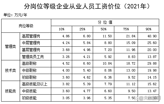 人社部近日发布2021年企业薪酬调查信息,披露了工资价位数据。