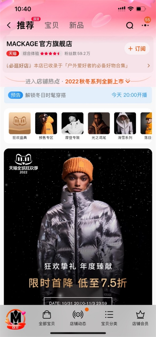 今年双11,加拿大高端时尚外套羽绒服品牌MACKAGE对天猫双11释放出极大诚意,不仅全场限时首降,折扣最低至75折,并携倪妮同款羽绒服LOGAN、王一博同款奶油皮衣MAGNUS、全球销量TOP款JENI羽绒服等超级尖货,集体参与双11,还加赠如品牌定制羊毛帽、围巾等多重正品好礼。