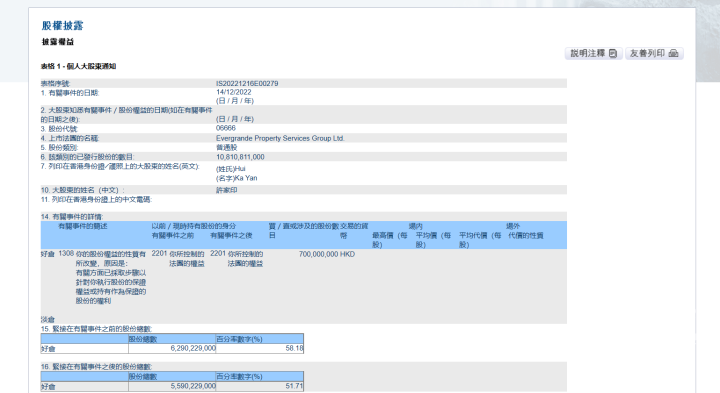 橙柿互动报道 据港交所最新披露信息,12月14日,中国恒大减持7亿股恒大物业股权,持股比例从58.18%下降至51.71%。
