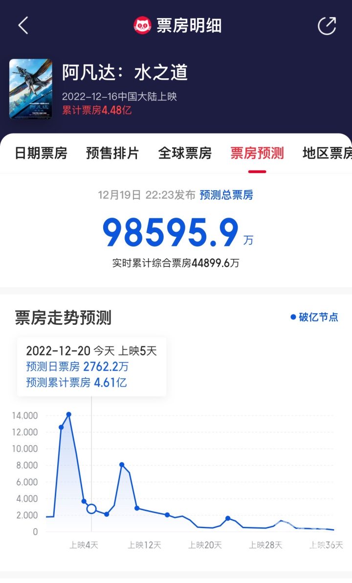 不过《阿凡达2》其票房成绩表现也与预期相差甚远,猫眼专业版的预测票房已经从此前的30亿元骤降至10亿元。