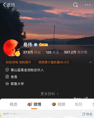 易伟,男,1971年11月出生,上海春山新棠投资管理有限公司法定代表人,其微博宣传自称毕业于耶鲁大学,富有投资经验,是大型美元基金管理人,也是前微博“知名大V”,目前粉丝数37.6万人。