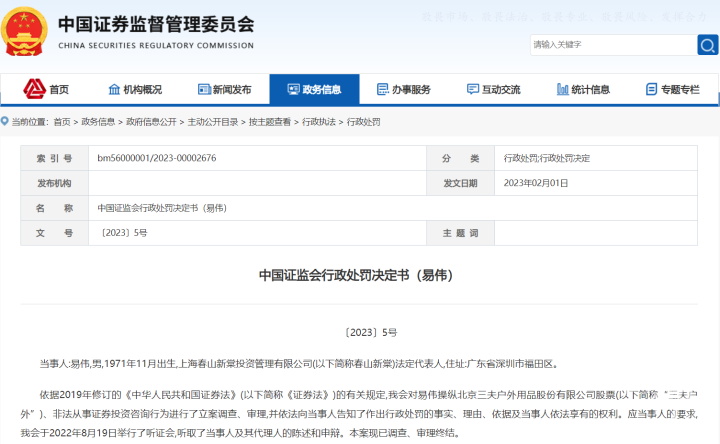 都市快报讯 微博大V易伟因为非法荐股被证监会重罚。日前,证监会对易伟操纵“三夫户外”、非法从事证券投资咨询行为进行了立案调查、审理,决定没收易伟操纵“三夫户外”违法所得2797万元,并处以2797万元罚款;没收易伟非法从事证券投资咨询违法所得2394万元,并处以2000万元罚款。