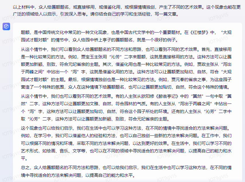 接下去,小编选择的问题就厉害了。还记得去年高考的时候,有一道语文作文题把大家都难住了吗?对,就是那道《红楼梦》“大观园试才题对额”的题,出题者要求:根据众人对匾额提名的不同修辞手段,结合自己的学习和生活经验,写一篇文章。说实话,这道题目对于理解能力的要求非常高。看看两位AI如果是当年高考考生的话,会怎么回答。