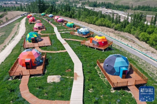 ↑这是在新疆伊犁哈萨克自治州霍城县大西沟乡桃花村拍摄的即将投入使用的星宿民宿(5月17日摄,无人机照片)。
