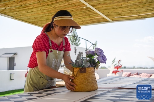 ↑新疆伊犁哈萨克自治州霍城县芦草沟镇四宫村一家民宿的工作人员在用花布置就餐区(5月17日摄)。