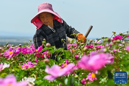 ↑工人在新疆伊犁哈萨克自治州伊宁县天山花海国家农业产业园为花田除草(5月18日摄)。