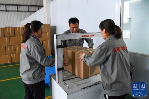 ↑工作人员在位于新疆伊犁哈萨克自治州的新疆汇嘉生物科技有限公司生产车间包装甜叶菊产品(5月17日摄)。