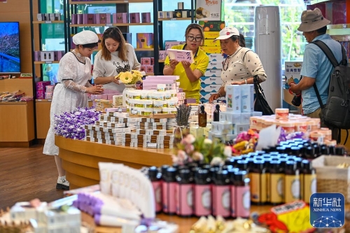 ↑游客在新疆伊犁哈萨克自治州伊宁县天山花海国家农业产业园服务中心选购特色产品(5月18日摄)。