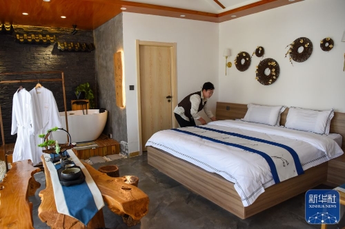 ↑新疆伊犁哈萨克自治州霍城县大西沟乡桃花村一家民宿的老板在整理客房(5月17日摄)。