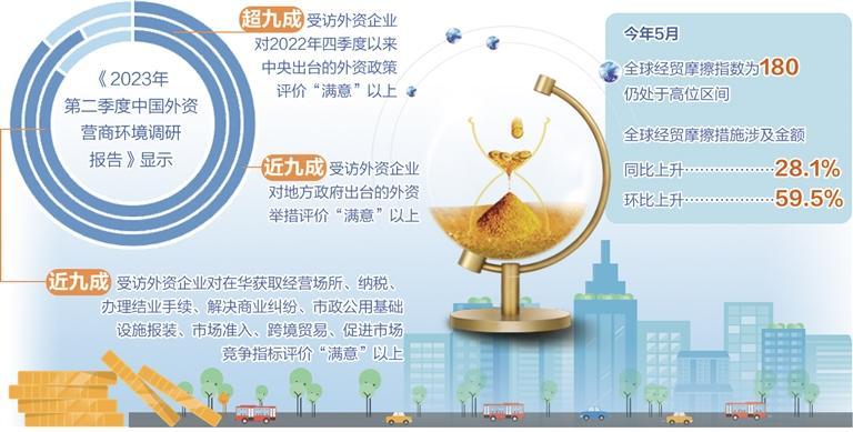 经济日报报道 7月28日,中国贸促会发布《2023年第二季度中国外资营商环境调研报告》。该报告显示,近九成受访外资企业对在华获取经营场所、纳税、办理结业手续、解决商业纠纷、市政公用基础设施报装、市场准入、跨境贸易、促进市场竞争指标评价“满意”以上。超九成受访外资企业对2022年四季度以来中央出台的外资政策评价“满意”以上,近九成受访外资企业对地方政府出台的外资举措评价“满意”以上。