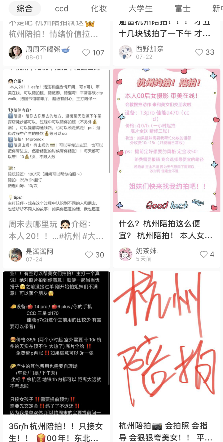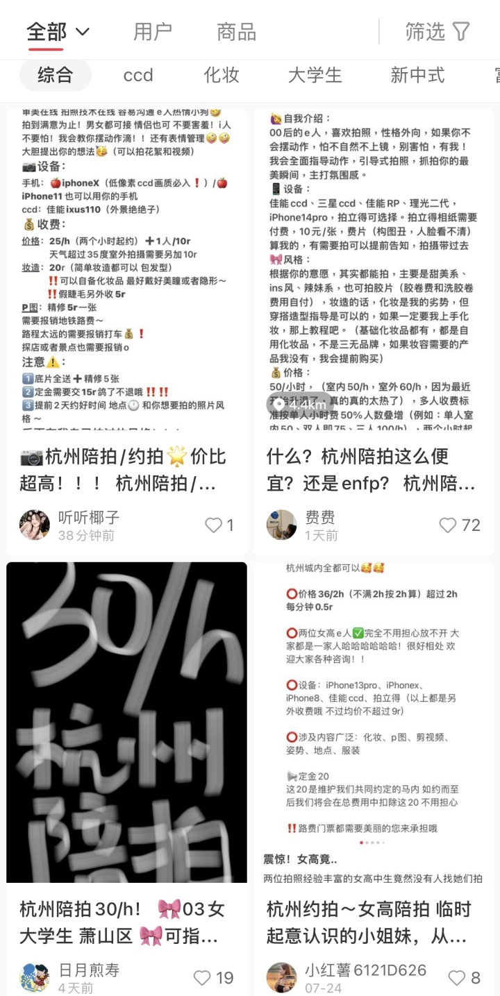 记者在小红书中找到了陪拍摄影师费费,“来找我的人都是来杭州旅游或是探店的博主,他们看到小红书的文案后感兴趣就会私聊我,跟我确定拍照时间、地点、风格等,我也会给他们提供一些穿搭建议。”