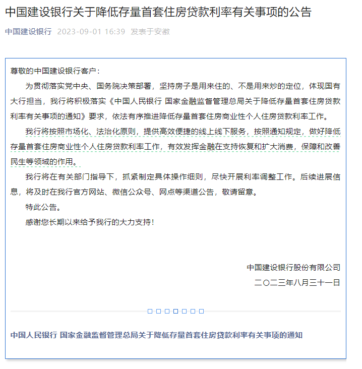 今天(9月7日),中国工商银行、中国农业银行发布关于存量首套个人住房贷款利率调整的公告。
