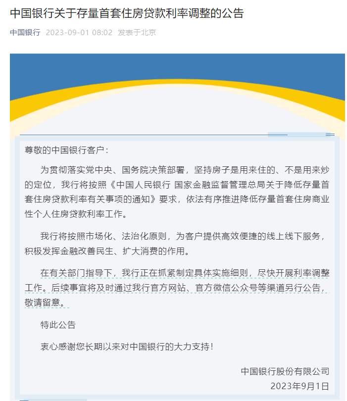 此前,中国银行、中国建设银行相继发布公告,调整存量首套住房贷款利率。