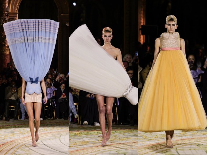 除了饰品,包包以外,还有一些设计奇葩的衣服,比如Viktor&Rolf高定系列裙子移位,让裙子横着穿,竖着穿,倒着穿,侧着传穿,通过3D打印固定结构和纱线,保持裙子不乱。有人表示不理解,也有人表示这个创意挺有意思的。