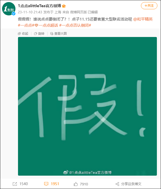 橙柿互动报道 11月10日晚,1点点奶茶在其官方微博发文,澄清此前相关的倒闭谣言,“假假假!谁说点点要倒闭了?!点子11.15还要官宣大型联名活动呢。”博文还@了和平精英官方微博,预告联名活动的对象。