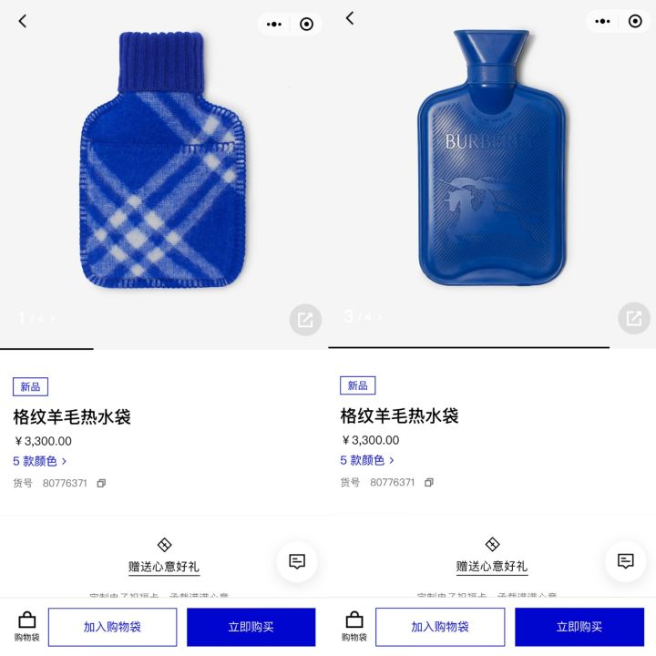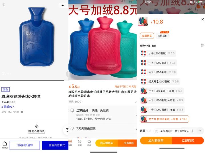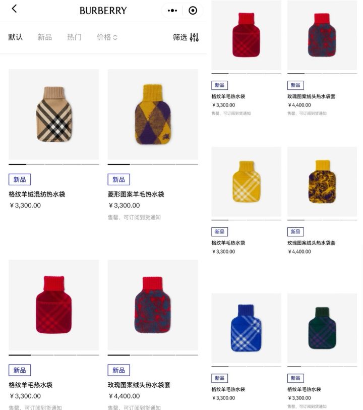 都市快报讯 如果有人问起奢侈品的尽头是什么?我想大多数人应该回答不上来,因为你永远都不知道下一个让你震惊的单品是什么。Gucci(古驰)以前卖不防水的雨伞,Balenciaga(巴黎世家)卖过世界上最贵的薯片包。但万万没想到的是有一天热水袋会成为奢侈品,近日,Burberry(巴宝莉)推出了一款高价热水袋,售价从3300元—4400元不等,有部分款还处于售罄状态,需要等待上架通知,到底有何等魅力让“天价”热水袋还如此畅销?因此一条关于“巴宝莉赚不到我一分钱”的词条一路冲上热搜。