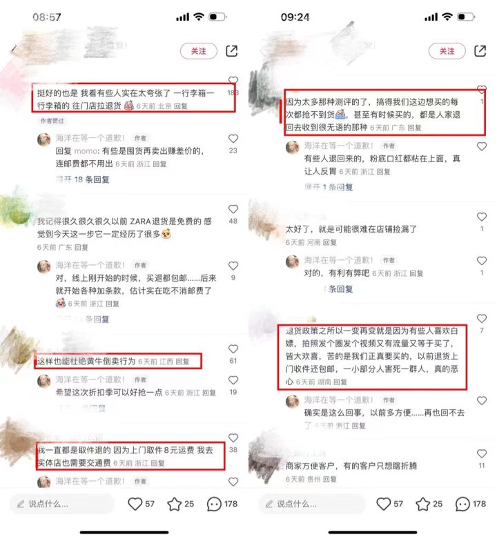 也有非议的网友,有人指出要减少退货,还得从根本上提升服装质量和品控,比如服装尺码最好有个统一标准,不要那么迷之难解让人永远拿捏不准,对于有时得买L码,有时XS正合适的ZARA,很多网友都会一次同款下单两到三个尺码,最终留下合适的一件,其余退货也就在所难免了。还有网友提出高退货率也和ZARA总是降价促销,且促销折扣没有最低只有更低有关。