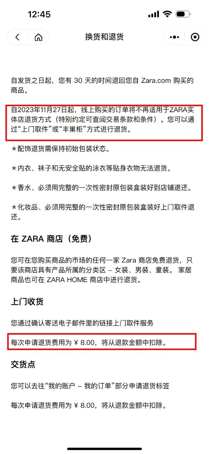 有关政策变更涉及到的购物平台ZARA官网,APP和小程序,目前,小程序的“换货和退货”条款细则已明确显示自2023年11月27日起,线上购买的订单将不再适用于ZARA实体店退货方式,改为“上门取件“或”丰巢柜“的方式进行。且每次申请退货费用为8元,该笔费用会从退款金额中扣除。