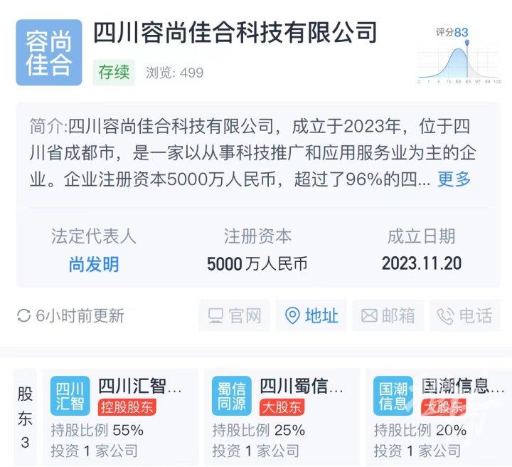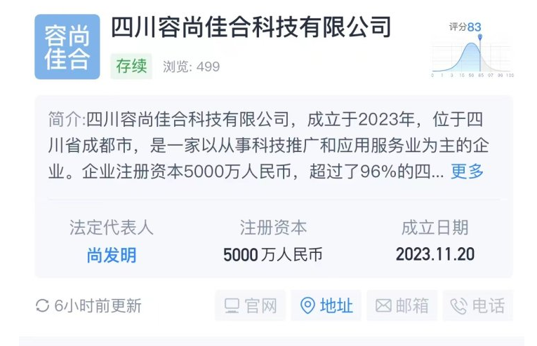 公开信息显示,四川容尚佳合科技有限公司成立于11月20日,也就是本周一,注册资本为5000万元。