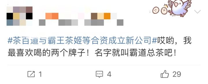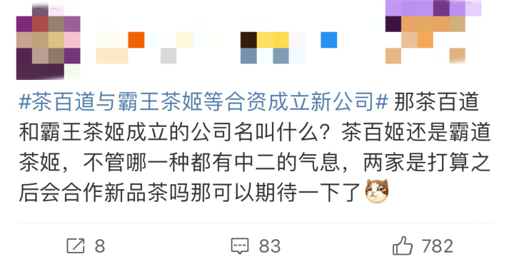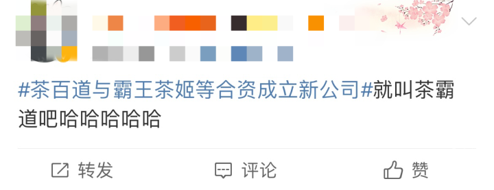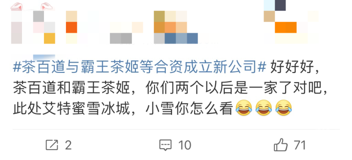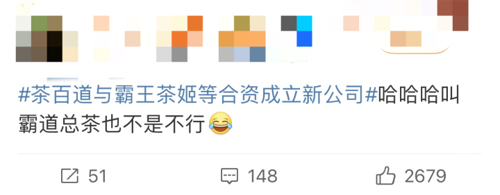 两大茶饮品牌茶百道和霸王茶姬合资成立了一家新公司,23日登上了热搜。