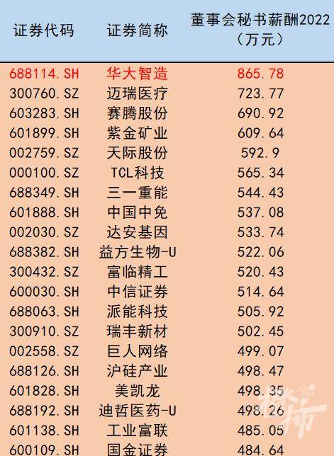 2022年A股董秘薪酬排行top20