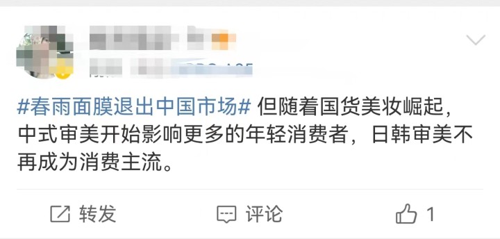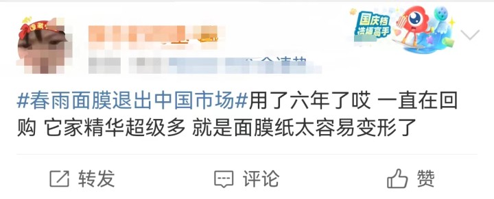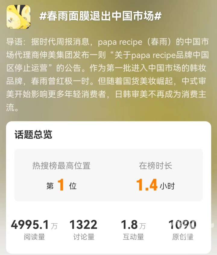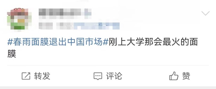 12月8日,#春雨面膜退出中国市场#话题上了微博热搜第一,曾经在国内红极一时的春雨面膜宣布将停止运营。