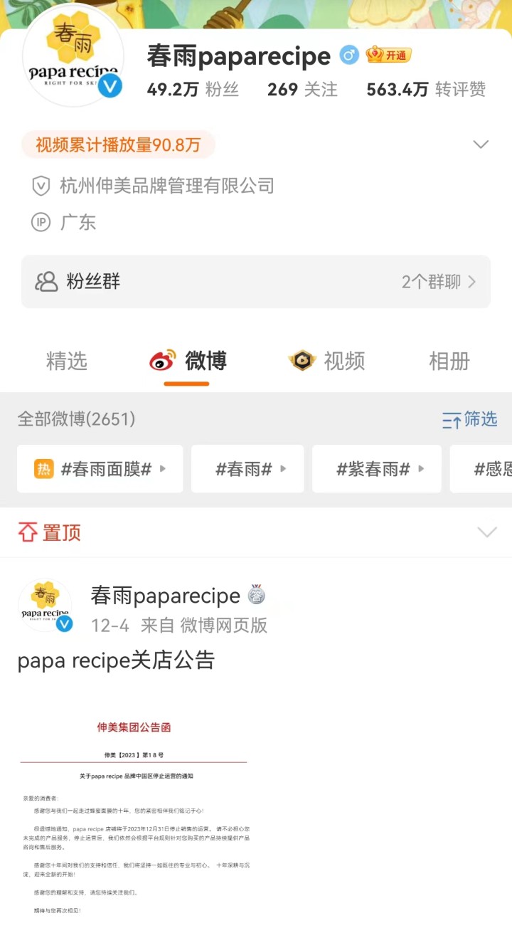 papa recipe(春雨)中国市场代理商伸美集团在12月4日发布了关于papa recipe品牌中国区停止运营的通知,12月6日,关于papa recipe品牌中国区停止运营”的公告出现在春雨面膜天猫旗舰店。