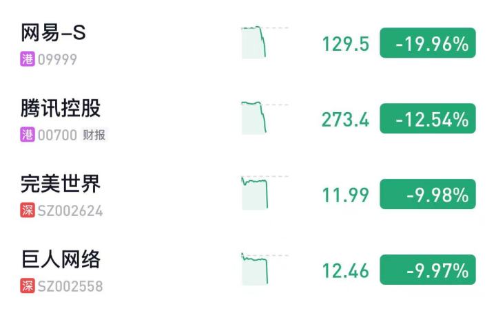 此意见征求稿发出后,多家与游戏有相关业务的互联网公司,股票相继出现下滑,截至记者发稿,网易-S跌幅20%,腾讯跌幅超过14%。完美世界、巨人网络均有大幅下跌。