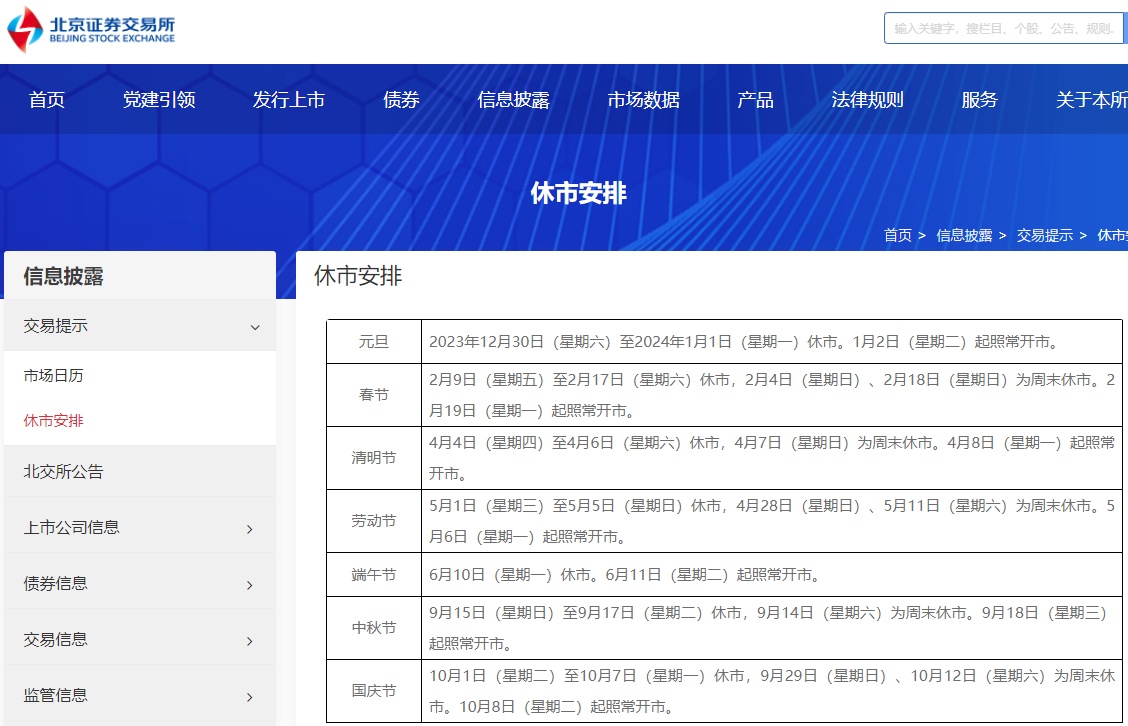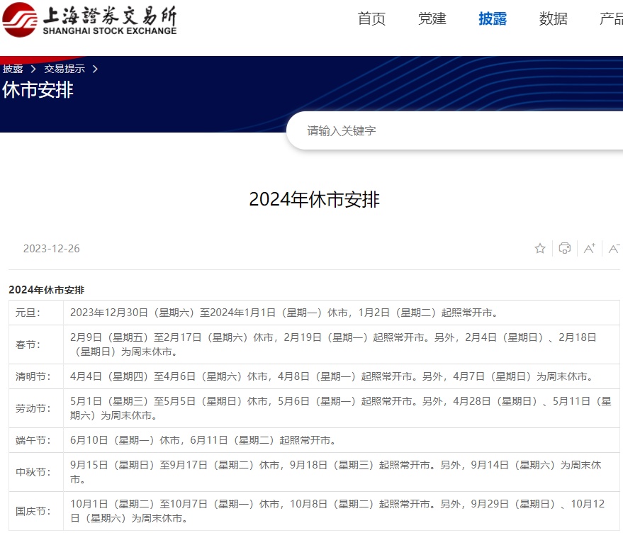 上海证券交易所、深圳证券交易所、北京证券交易所公布2024年休市安排,除夕当日休市。2月9日(星期五)至2月17日(星期六)休市,2月19日(星期一)起照常开市。另外,2月4日(星期日)、2月18日(星期日)为周末休市。