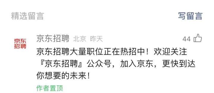 同时在评论区置顶留言显示,京东大量职位正在热招中。