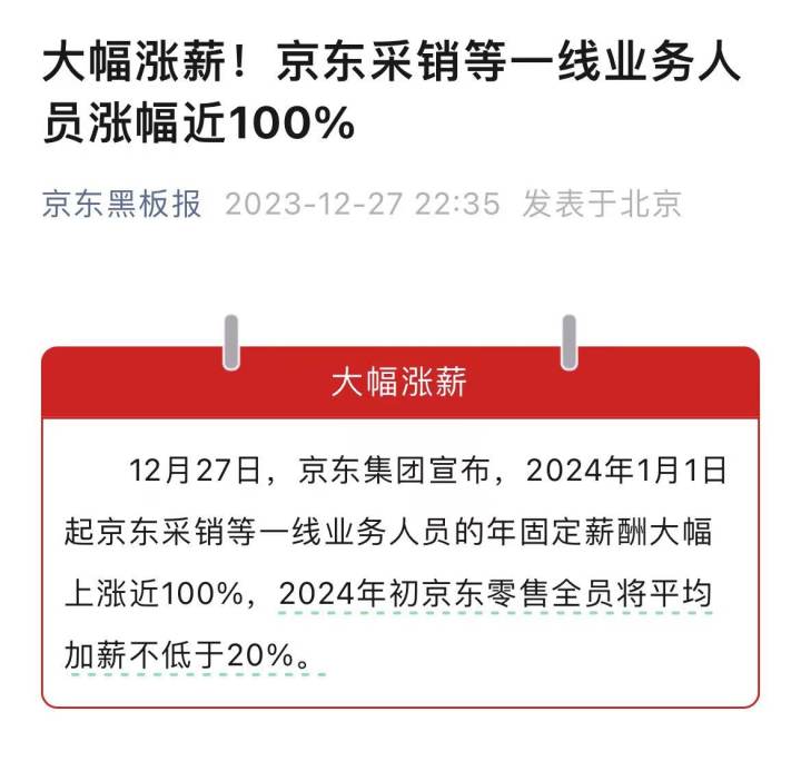 12月27日晚,京东集团发布消息,2024年1月1日起京东采销等一线业务人员的年固定薪酬大幅上涨近100%,2024年初京东零售全员将平均加薪不低于20%。