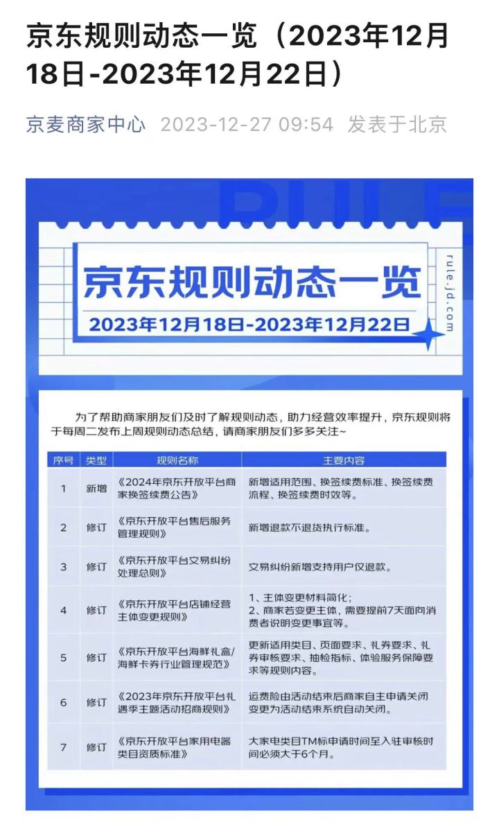 紧接着,有网友发现,京东平台规则网站显示,京东近期修订《京东开放平台交易纠纷处理总则》,主要内容为交易纠纷新增支持用户仅退款。