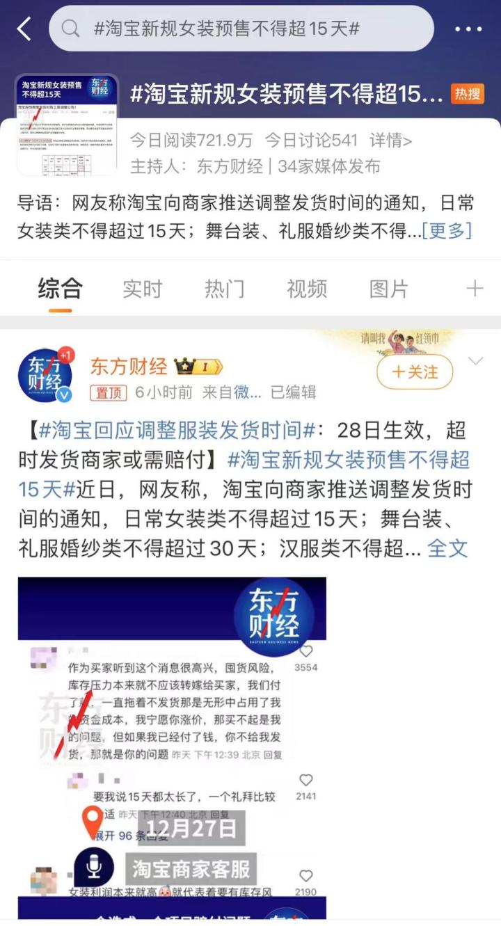 当晚,据媒体报道,淘宝近日已向商家推送调整发货时间通知,日常女装类不得超过15天;舞台装、礼服婚纱类不得超过30天;汉服类不得超过45天。有媒体询问了淘宝客服,对方表示,本次调整将于12月28日生效,平台对于服装类目的商家整体发货水平进行调整。如果超时发货买家发起投诉,商家可能需要进行赔付。
