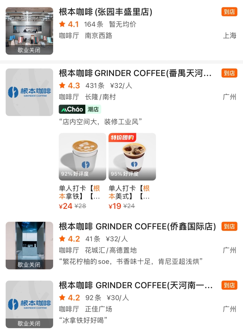 “根本咖啡 Grinder Coffee”公众号信息显示,根本咖啡做的是单一产地浓缩咖啡(SOE)。根本咖啡曾经开过4家门店,前三家门店均开在广州,分别是2022年5月开业的天河南一路店,2022年7月开业的番禺天河城旗舰店,以及2023年1月开业的侨鑫国际店。第四家门店则是因“天价咖啡”引起广泛关注的上海张园店。相关平台显示,三家广州门店的人均消费分别为32元、32元和30元。上海张园店则显示,暂无均价。