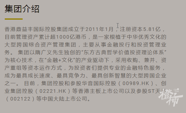 鼎益丰是由隋广义、马小秋最初于2011年1月创立,后来发展成多家名称中包含“鼎益丰”,或彼此存在股权、人员联系,但实际均由隋广义控制,包含多家港股公司的企业群体。