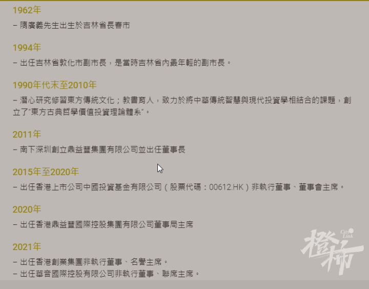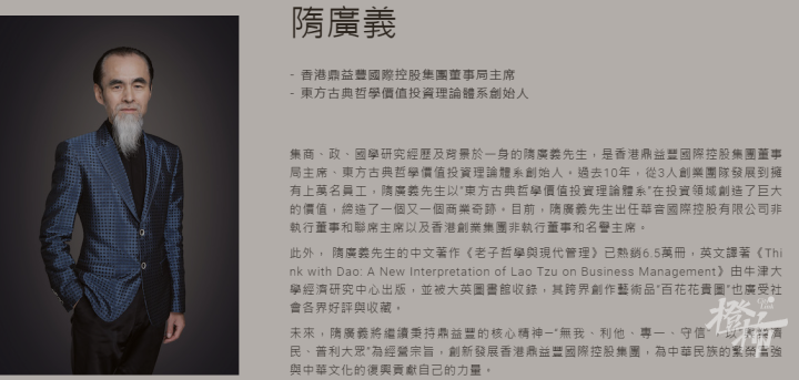 在鼎益丰官网可看到,隋广义声称自己曾为吉林省敦化市副市长,后修道出家,将东方禅易文化与现代投资术相结合,创立了“禅易投资法”,能精准预测金融投资的各种变化,是继股神巴菲特的价值投资法、金融大鳄索罗斯的对冲投资法后,又一崭新的创新投资法。