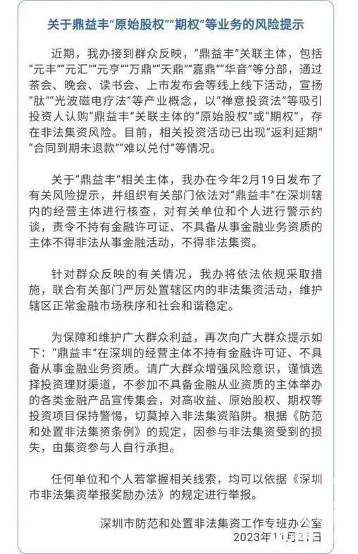 深圳市金融办在2023年2月19日发文称,陆续收到群众关于“鼎益丰理财”“鼎益丰投资”“鼎益丰基金”等相关业务咨询。经初步核查,鼎益丰关联的主体众多,且分布在全国各地,包括“元丰”“元汇”“元亨”“万鼎”“天鼎”“嘉鼎”“华音”等分部,通过茶会、晚会、读书会、上市发布会等线上线下活动,宣扬“肽”“光波磁电疗法”等产业概念,以“禅意投资法”等吸引投资人认购“鼎益丰”关联主体的“原始股权”或“期权”,存在非法集资风险。并且,鼎益丰在深圳的经营主体不持有金融许可证、不具备从事金融业务资质。