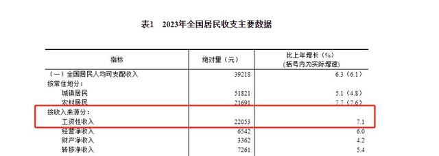 按收入来源分,2023年,全国居民人均工资性收入22053元,增长7.1%,占可支配收入的比重为56.23%。