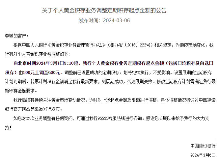 金价快速上涨也影响了银行的个人黄金业务。3月6日下午,建设银行发布公告称,根据中国人民银行《黄金积存业务管理暂行办法》相关规定,为顺应市场变化,对个人黄金积存业务进行调整,个人黄金积存业务定期积存起点金额(包括日均积存及自选日积存)由500元上调至600元。