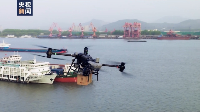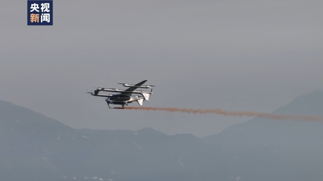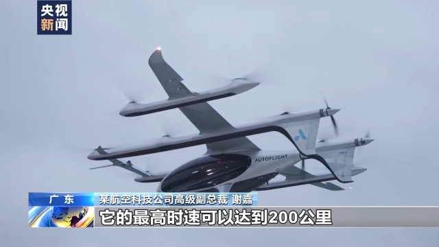 某航空科技公司高级副总裁 谢嘉:它最高时速可以达到200公里,单次充电飞行距离达到250.3公里,它还有一款载物的型号,最大载重400公斤。